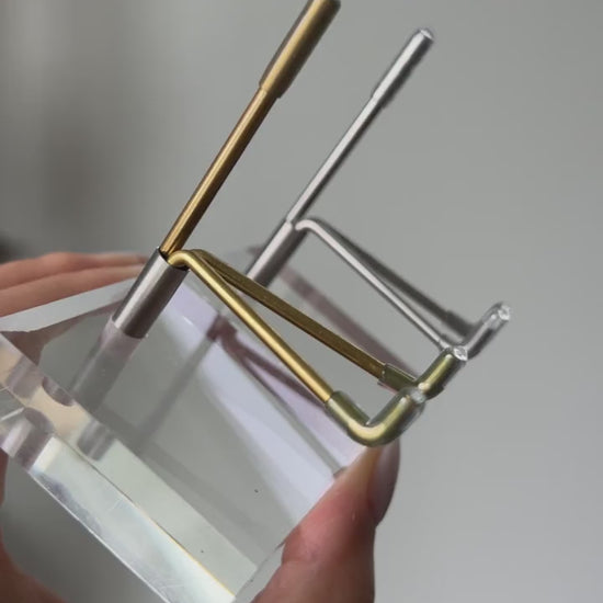 These stands have a clear acrylic base with gold or silver metal arm support. The arms are adjustable in width and can be adjusted to fit the crystal being displayed. These stands can fit slabs, geodes, specimens, etc. The stands can withstand weights of up to 8lbs if properly used.