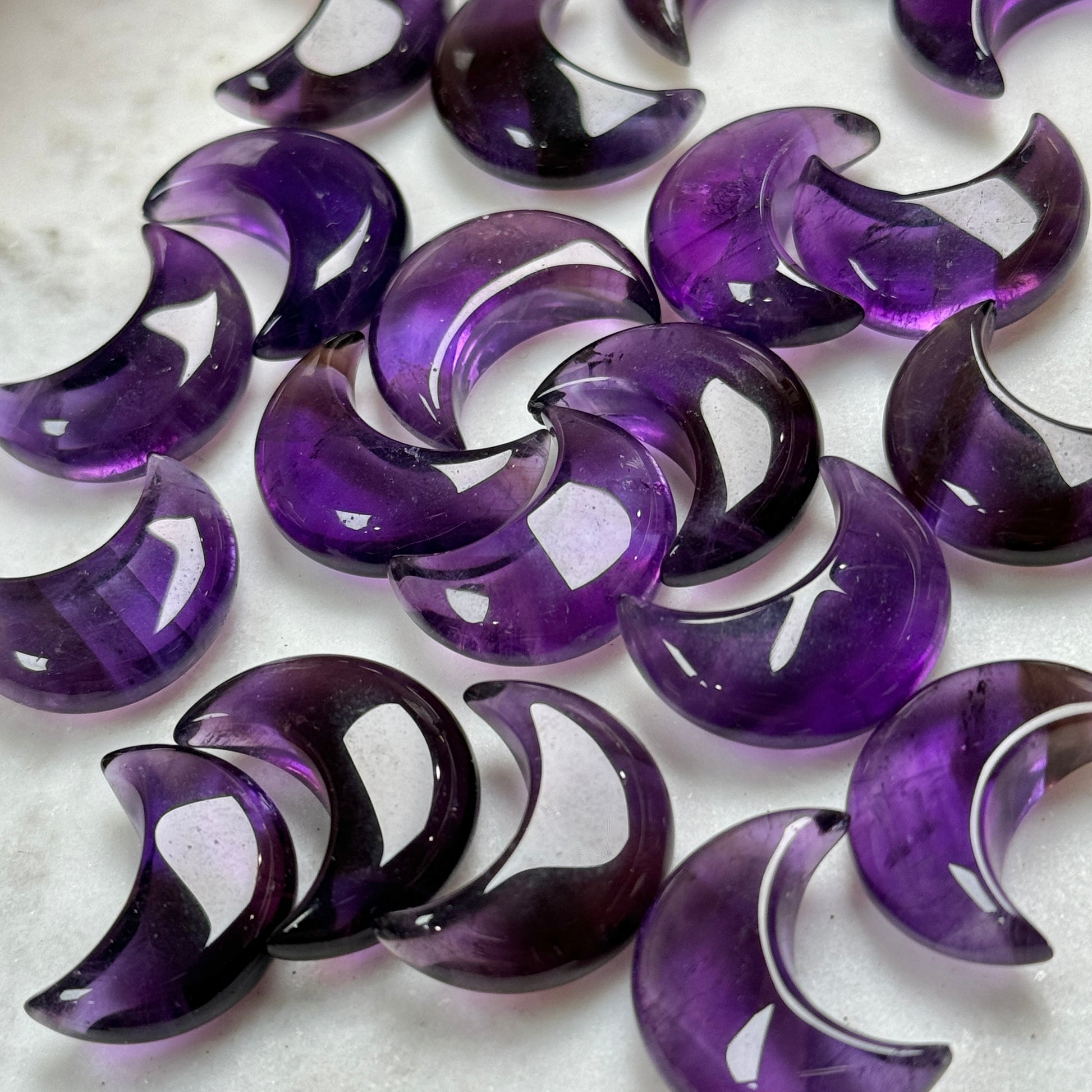 Bring a touch of vibrant contrast to your gem collection with these ametrine mini moons! Ametrine is a stunning gemstone known for its unique blend of amethyst's rich purple and citrine's bright yellow. Each mini moon showcases a beautiful interplay of these colors, with some featuring more prominent purple zones and others boasting yellow sections. The natural color variations make each mini moon one-of-a-kind.