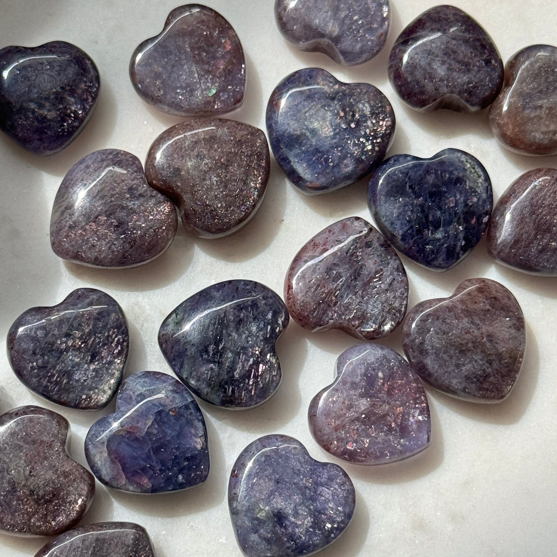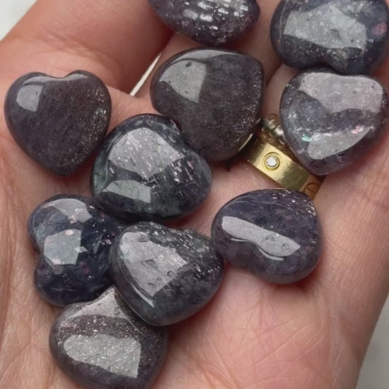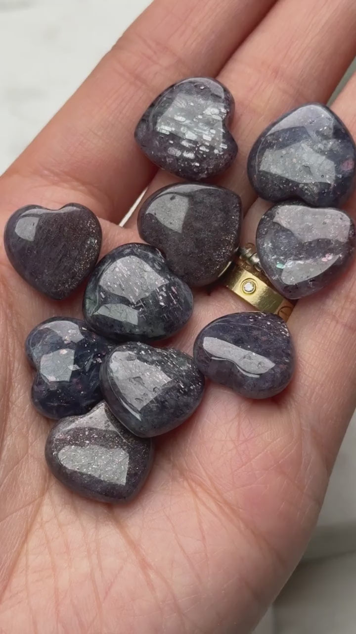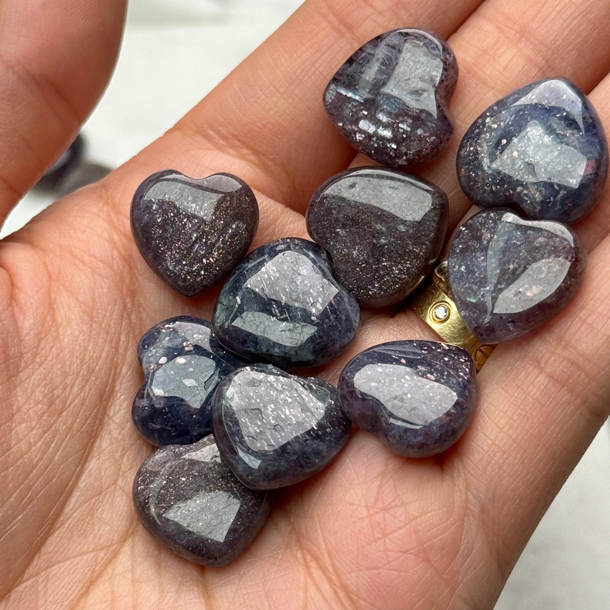 Each mini heart is polished to a smooth finish, showcasing the captivating interplay of the bloodshot iolite's unique color and the vibrant glitter.