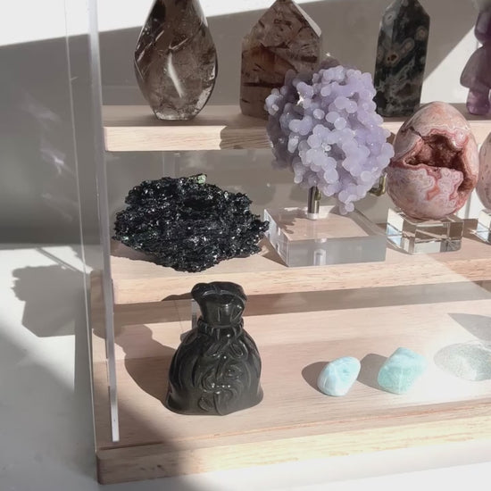 These crystal display cases were specifically designed and created by The Stone Queen Co for storing & displaying all of your precious crystals and minerals. There are three neutral colors to choose from - wood, white and black. Featuring a sleek, simple and elegant design, this is the perfect accessory for your crystal display.Â