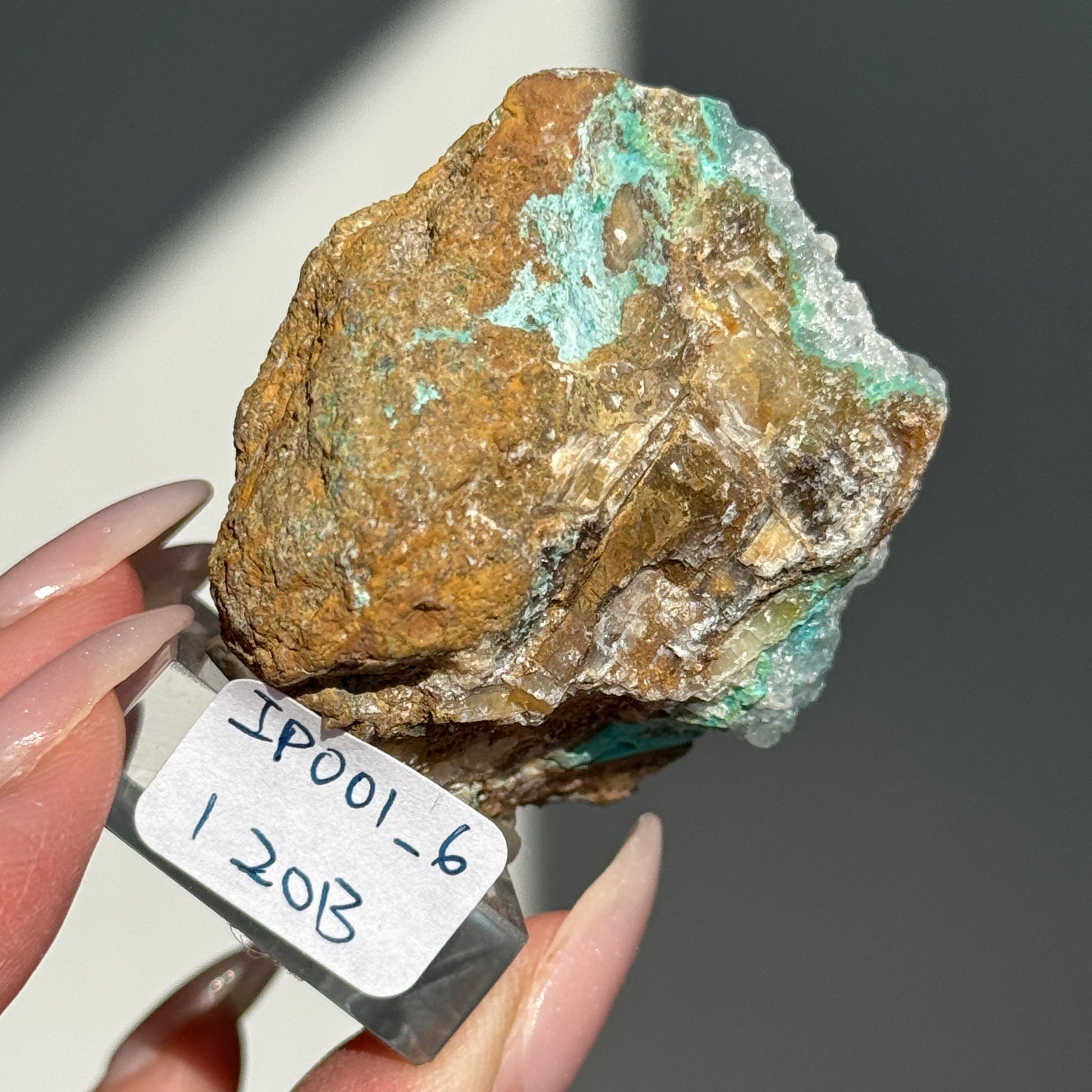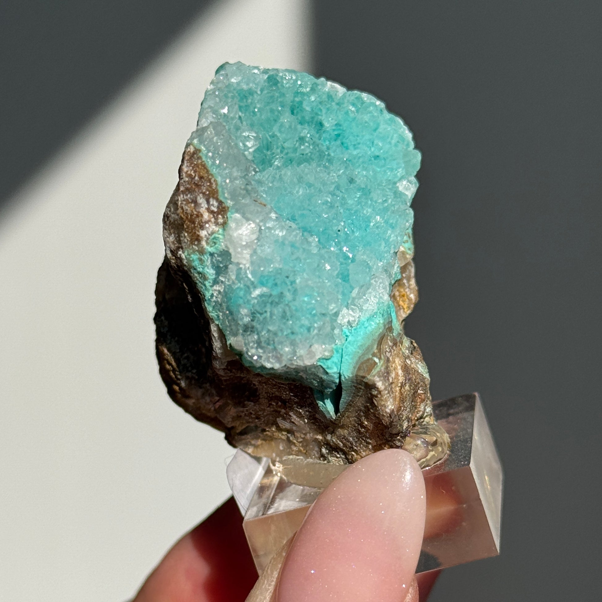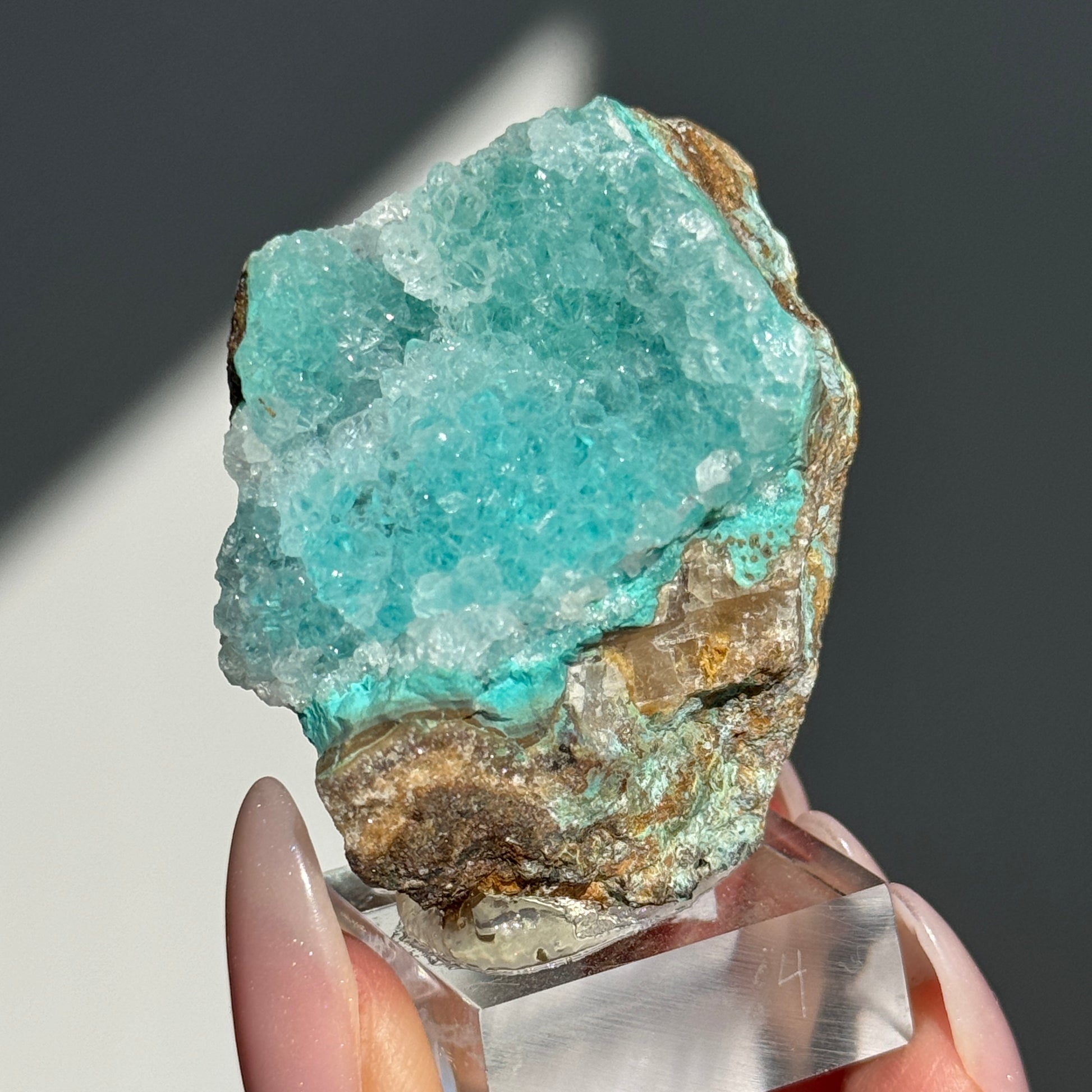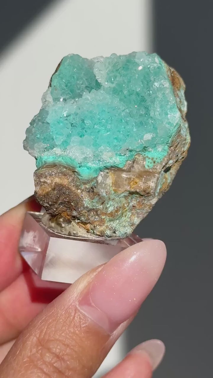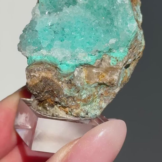 This incredible gem silica specimen comes from the Lily Mine in Peru. It boasts intense, vibrant colors with gem silica (chrysocolla), malachite and druzy quartz.