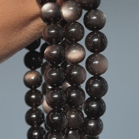 Formed from volcanic glass, Silver Sheen Obsidian boasts a unique and captivating characteristic. When light strikes the surface, a mesmerizing iridescence shimmers within, like moonlight dancing on a glacial lake. This signature sheen, caused by microscopic gas bubbles trapped within the stone, adds an otherworldly quality to each bracelet.