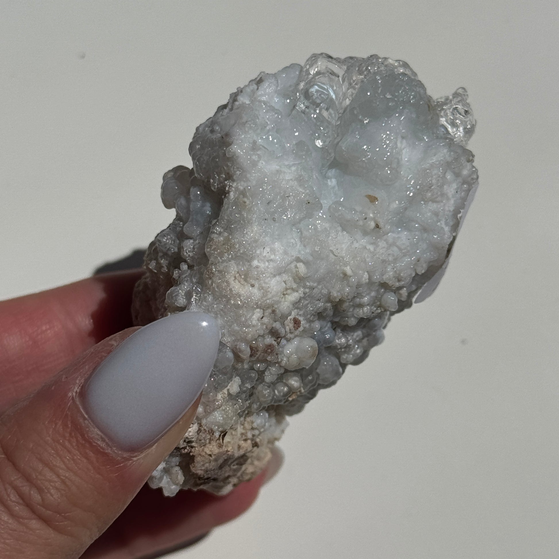 These captivating specimens showcase Blue Hyalite Opal, a unique variety of opal found in Mexico. This opal is distinguished by its translucent, glassy appearance and a delicate, often pale blue hue. A notable characteristic of Mexican Blue Hyalite Opal is its fluorescence under ultraviolet (UV) light. This fluorescence is caused by trace amounts of uranyl ions incorporated into the silica structure during its formation. When exposed to UV light, the uranyl ions absorb the energy and re-emit it as visible light, typically a bright green or yellow glow. The intensity of the fluorescence varies depending on the concentration of uranyl ions present.