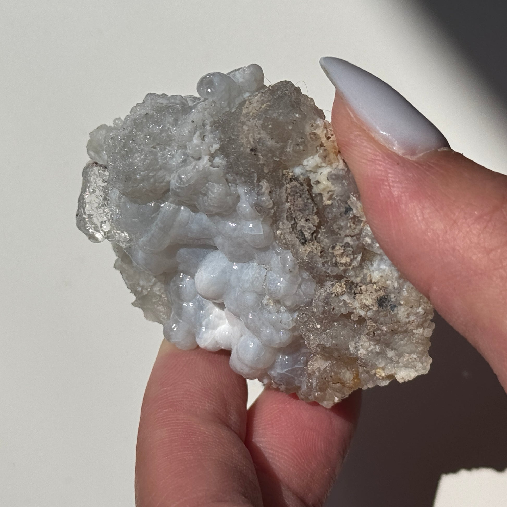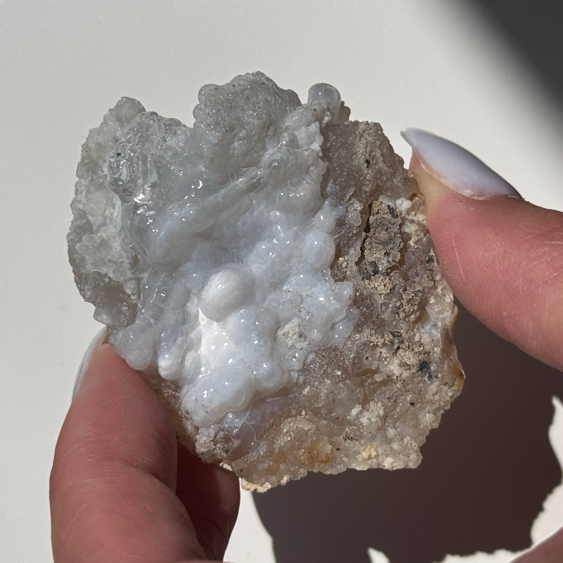 These captivating specimens showcase Blue Hyalite Opal, a unique variety of opal found in Mexico. This opal is distinguished by its translucent, glassy appearance and a delicate, often pale blue hue. A notable characteristic of Mexican Blue Hyalite Opal is its fluorescence under ultraviolet (UV) light. This fluorescence is caused by trace amounts of uranyl ions incorporated into the silica structure during its formation. When exposed to UV light, the uranyl ions absorb the energy and re-emit it as visible light, typically a bright green or yellow glow. The intensity of the fluorescence varies depending on the concentration of uranyl ions present.