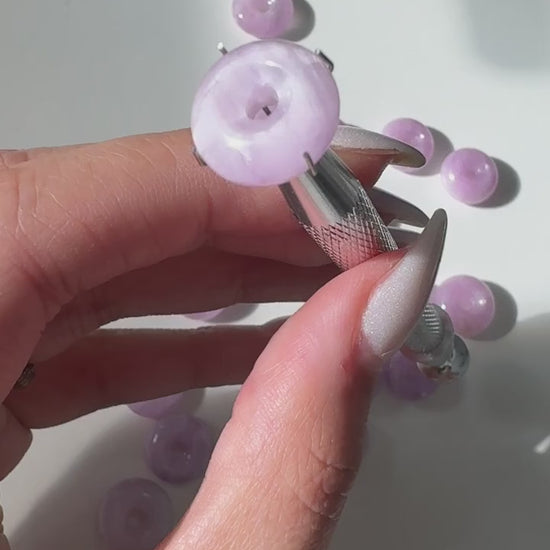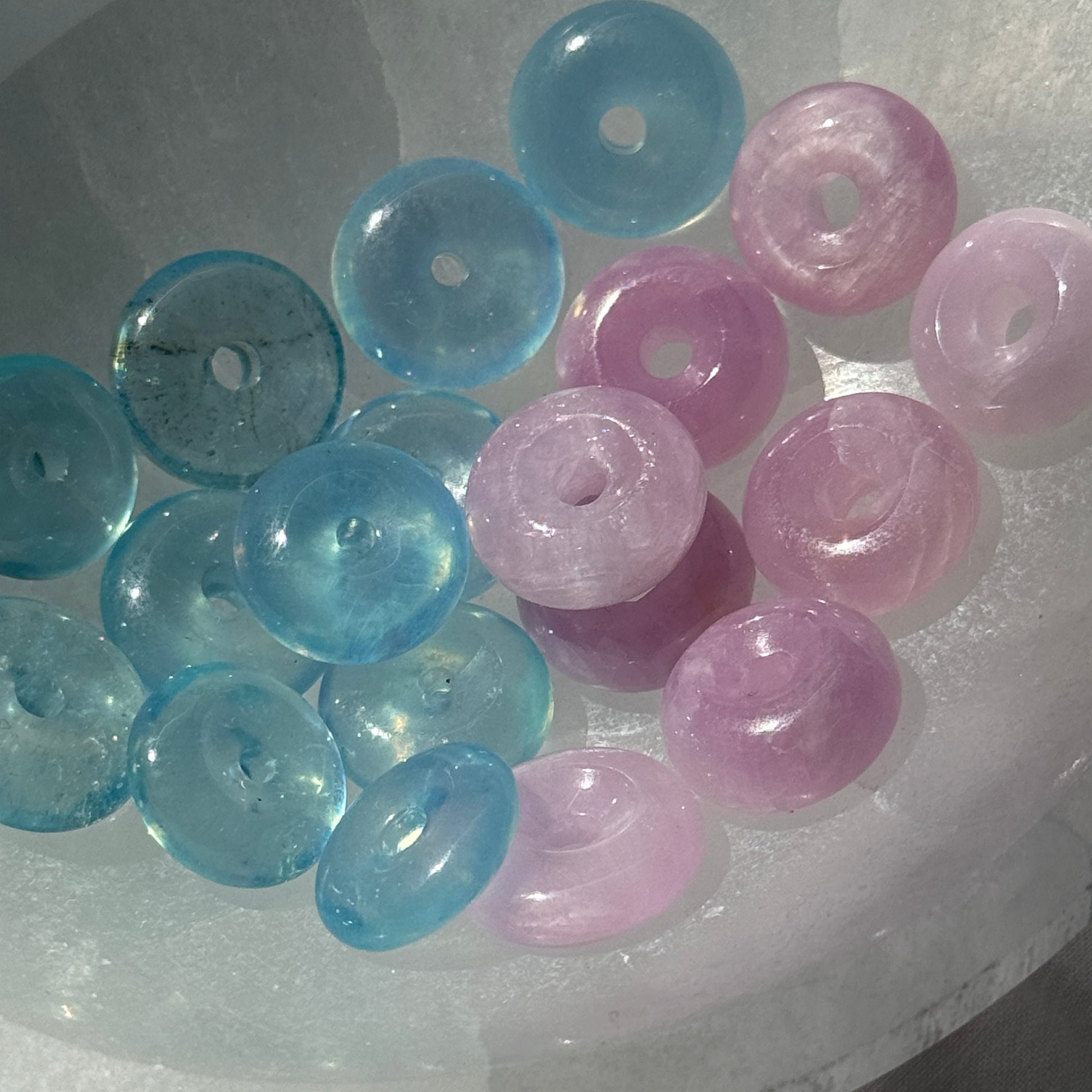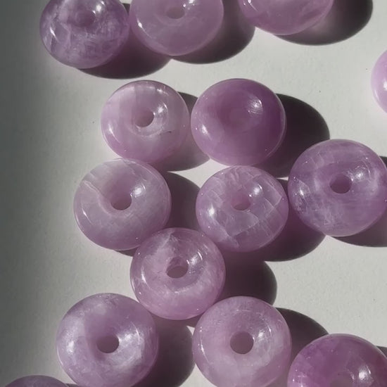 Discover the allure of Kunzite Donuts with Cat's Eye, a stunning crystal known for its captivating color and unique optical phenomenon. These captivating donuts showcase a vibrant purple pink hue, often with deeper purple undertones. The most striking feature is the mesmerizing cat's eye effect, a thin band of light that moves across the surface of the stone when it is rotated.