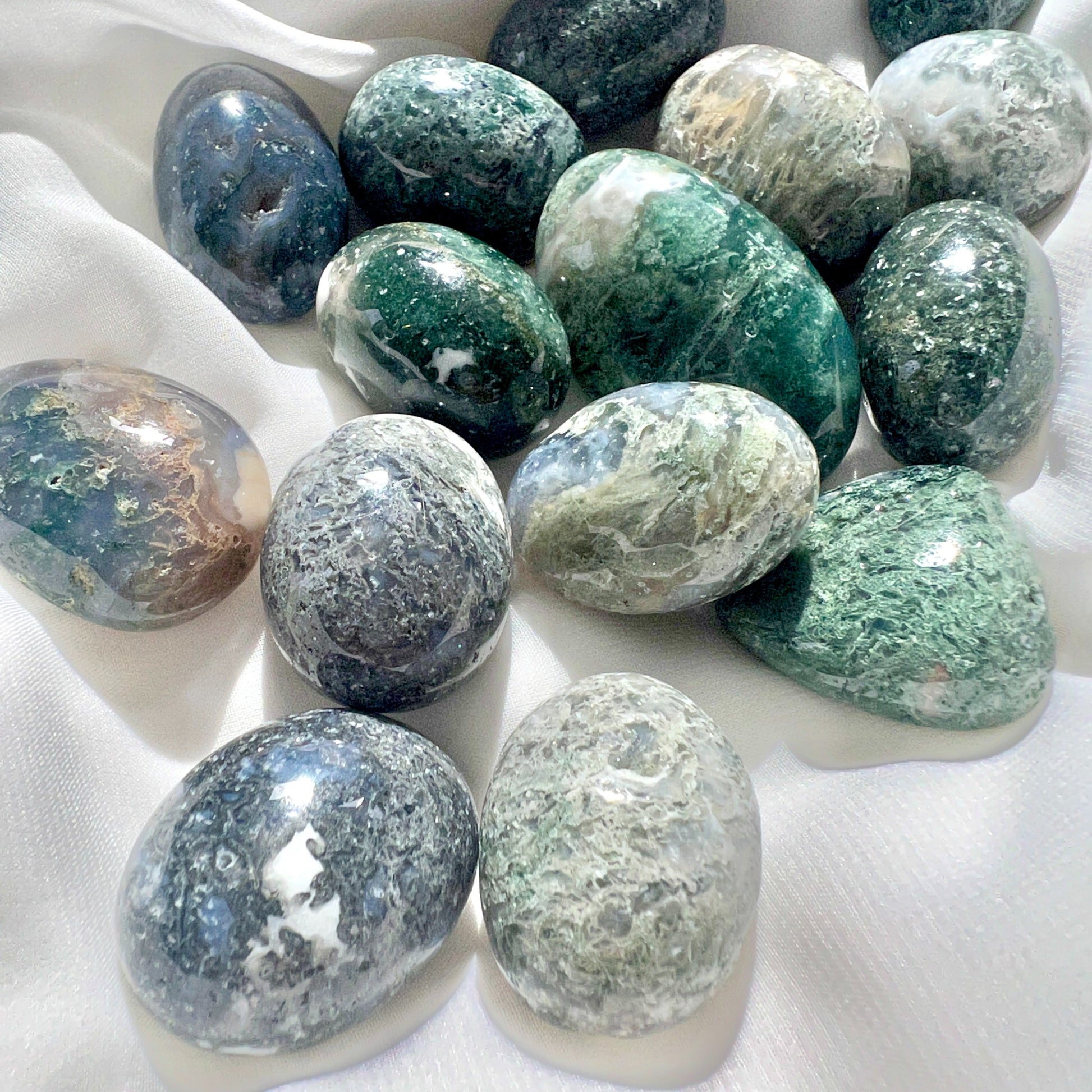 These beautiful pocket moss agate tumbles are pristine! Some even have druzy on them.