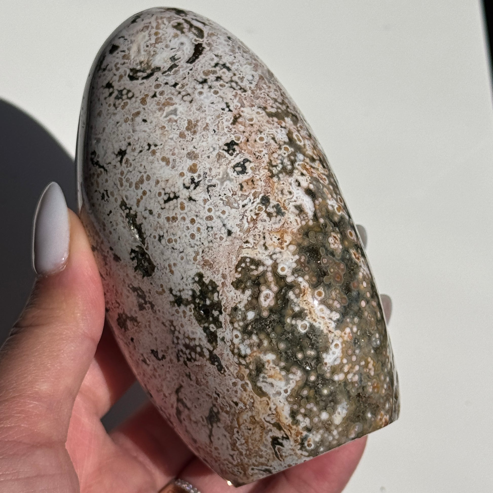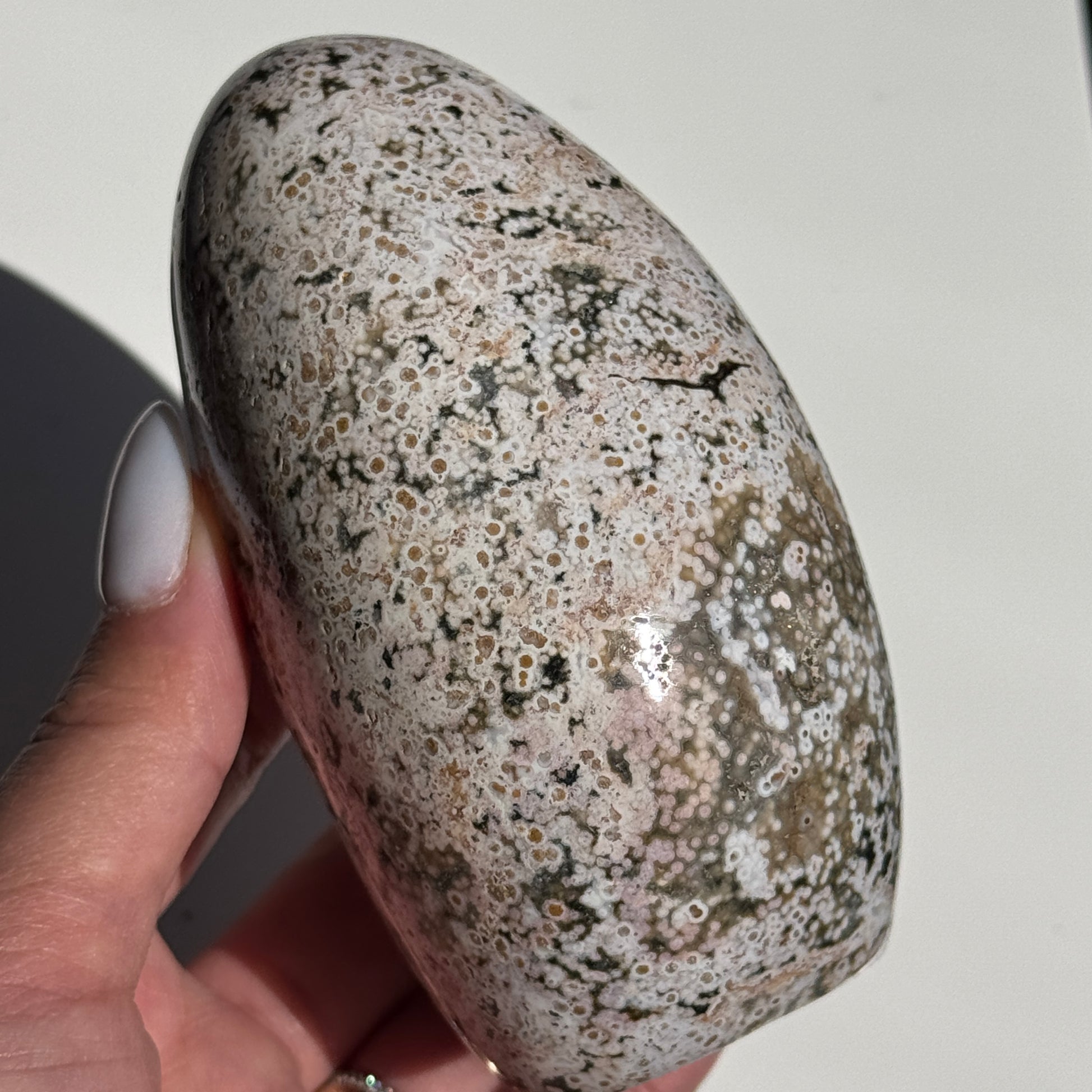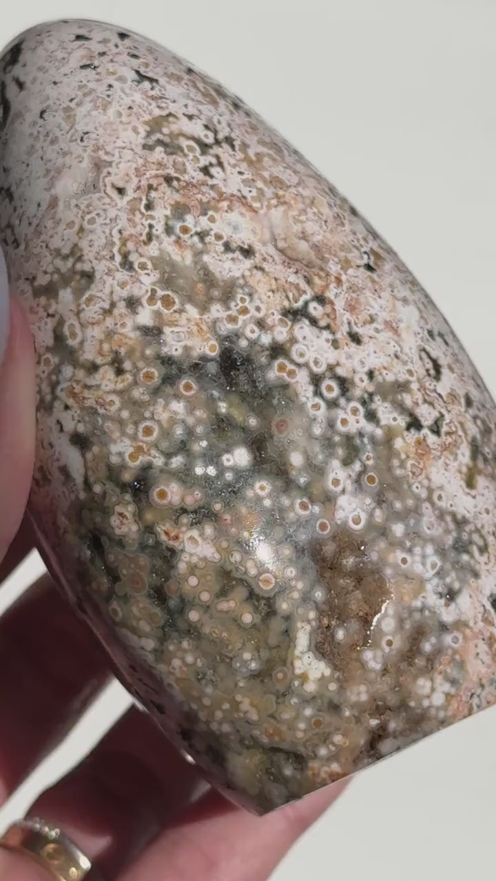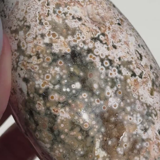 Characterized by its distinctive orbicular patterns, Ocean Jasper presents a stunning array of colors, including greens, whites, pinks, and browns, often arranged in striking, spherical or "eye-like" formations.