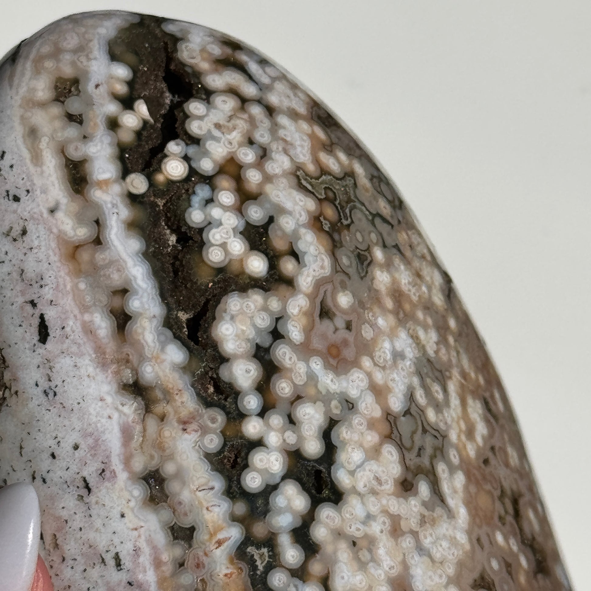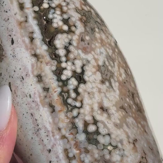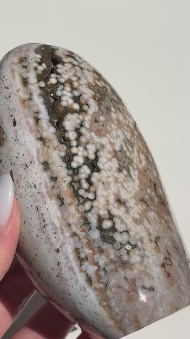 Characterized by its distinctive orbicular patterns, Ocean Jasper presents a stunning array of colors, including greens, whites, pinks, and browns, often arranged in striking, spherical or "eye-like" formations.