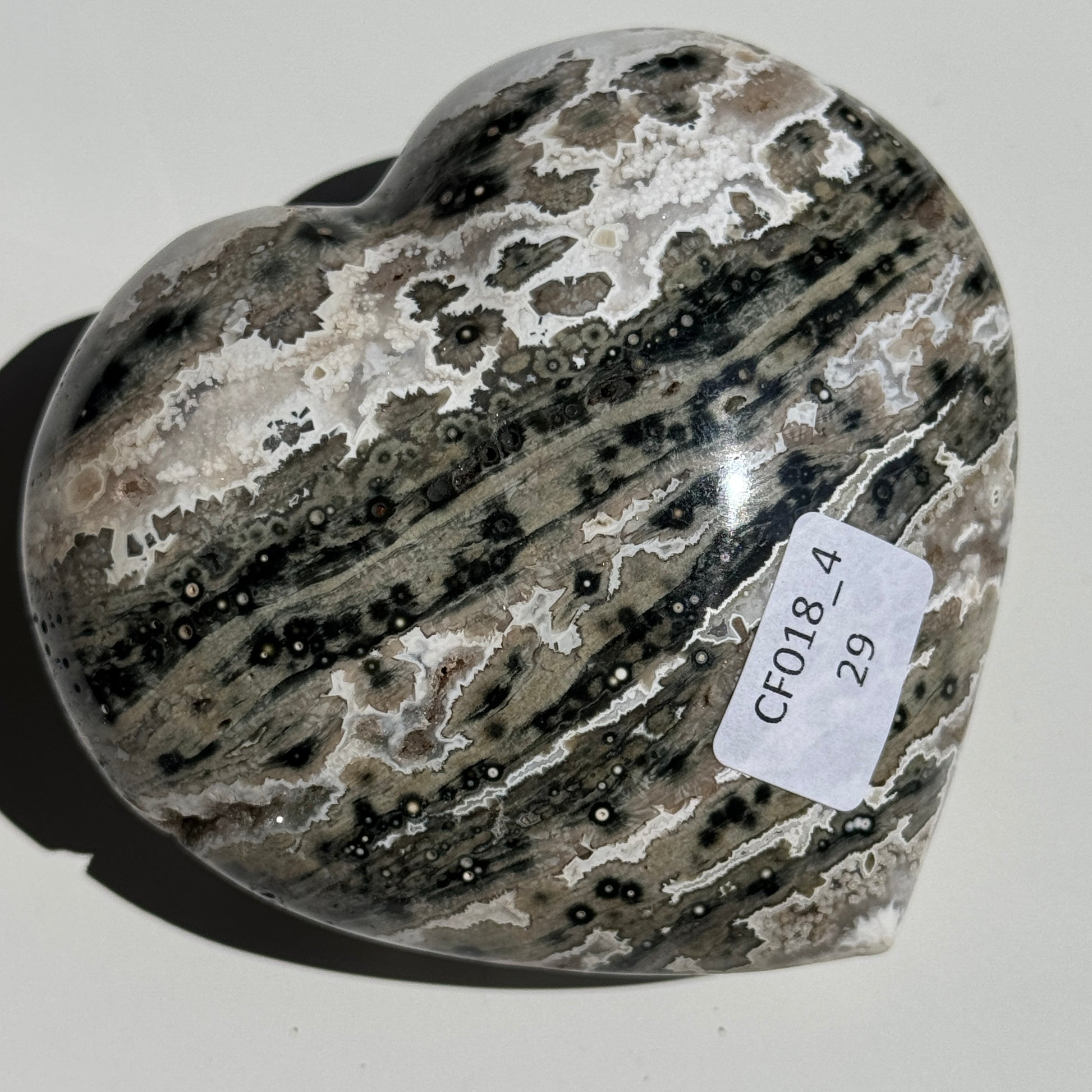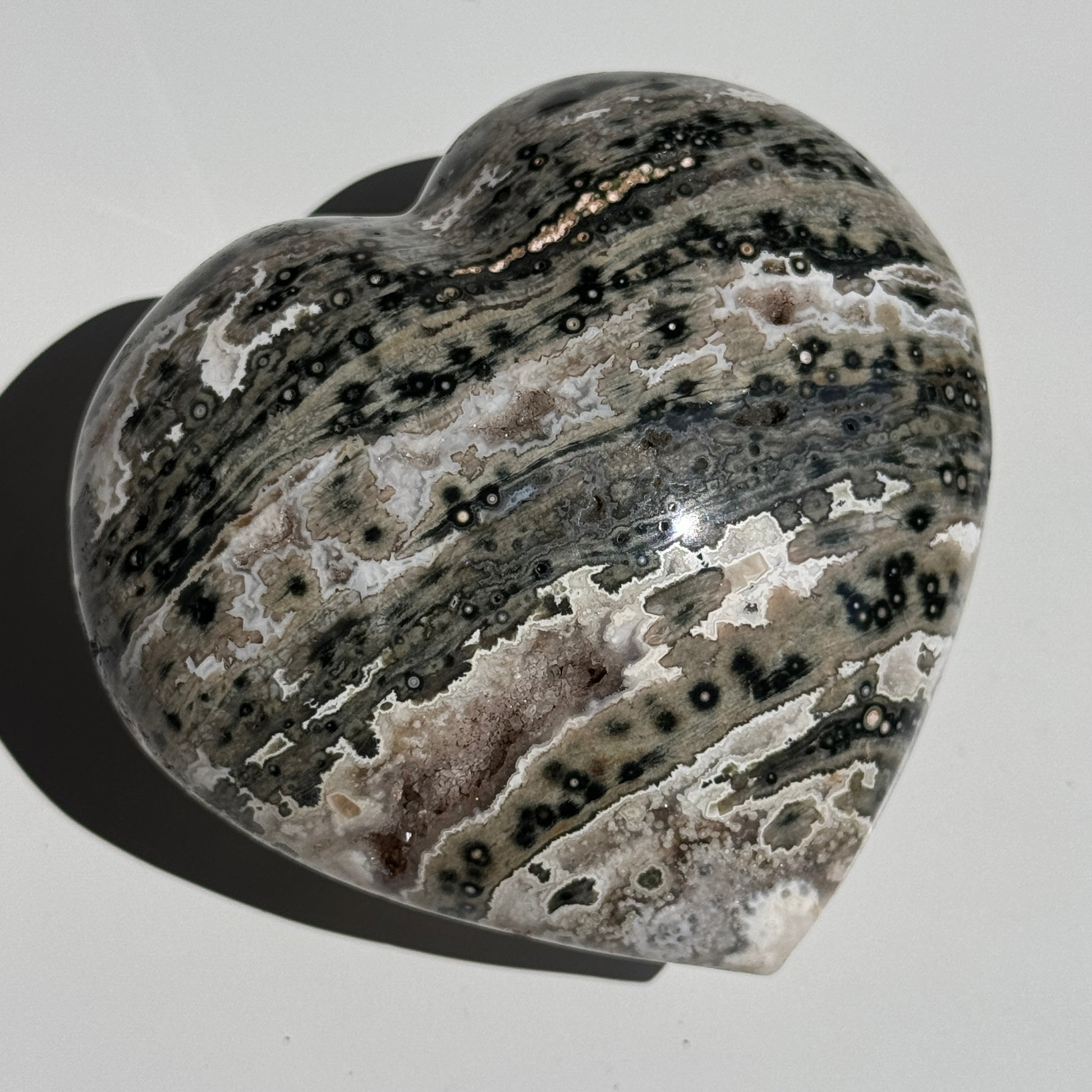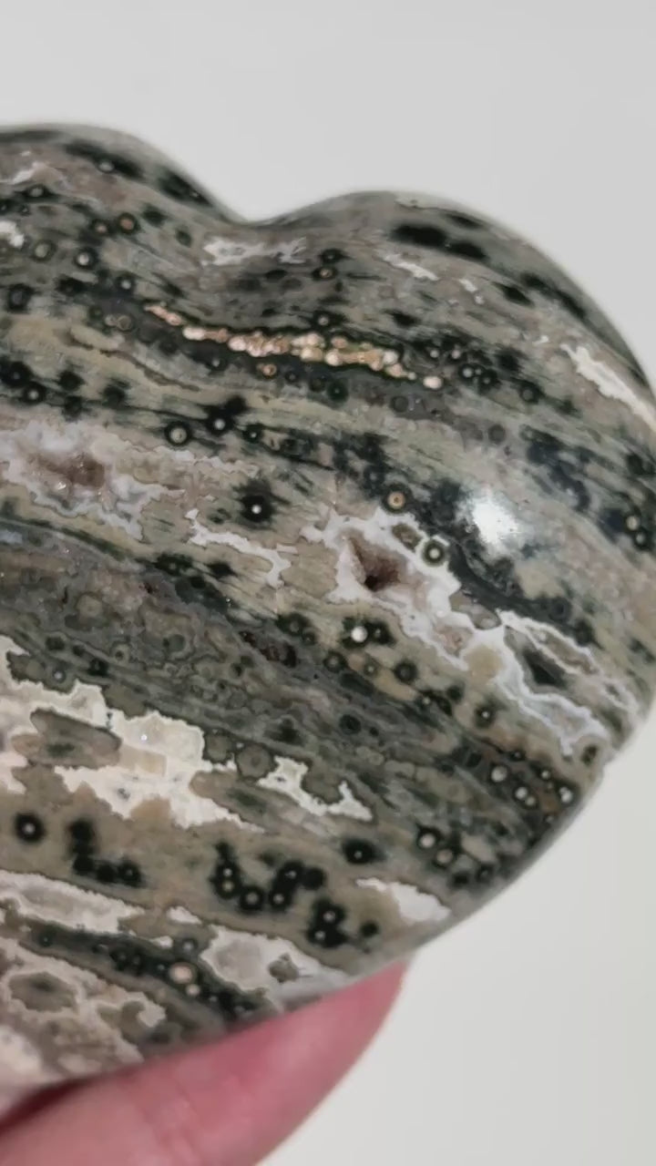Characterized by its distinctive orbicular patterns, Ocean Jasper presents a stunning array of colors, including greens, whites, pinks, and browns, often arranged in striking, spherical or "eye-like" formations.