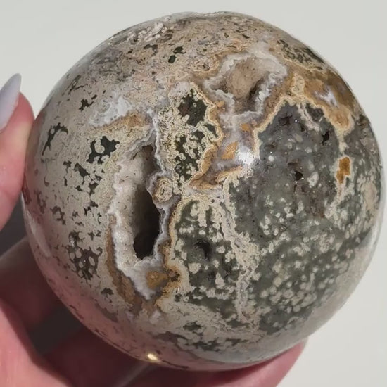 The formation of these orbs is a fascinating geological process. Ocean Jasper is primarily found in Madagascar, and its unique patterns are attributed to the rhythmic crystallization of silica within cavities in rhyolitic lava flows.As silica-rich fluids circulated through these cavities, they precipitated layers of chalcedony, creating the concentric or radiating patterns that define Ocean Jasper. The varying mineral compositions within the fluids, along with changes in temperature and pressure, contributed to the diverse color palettes and intricate designs seen in each sphere.