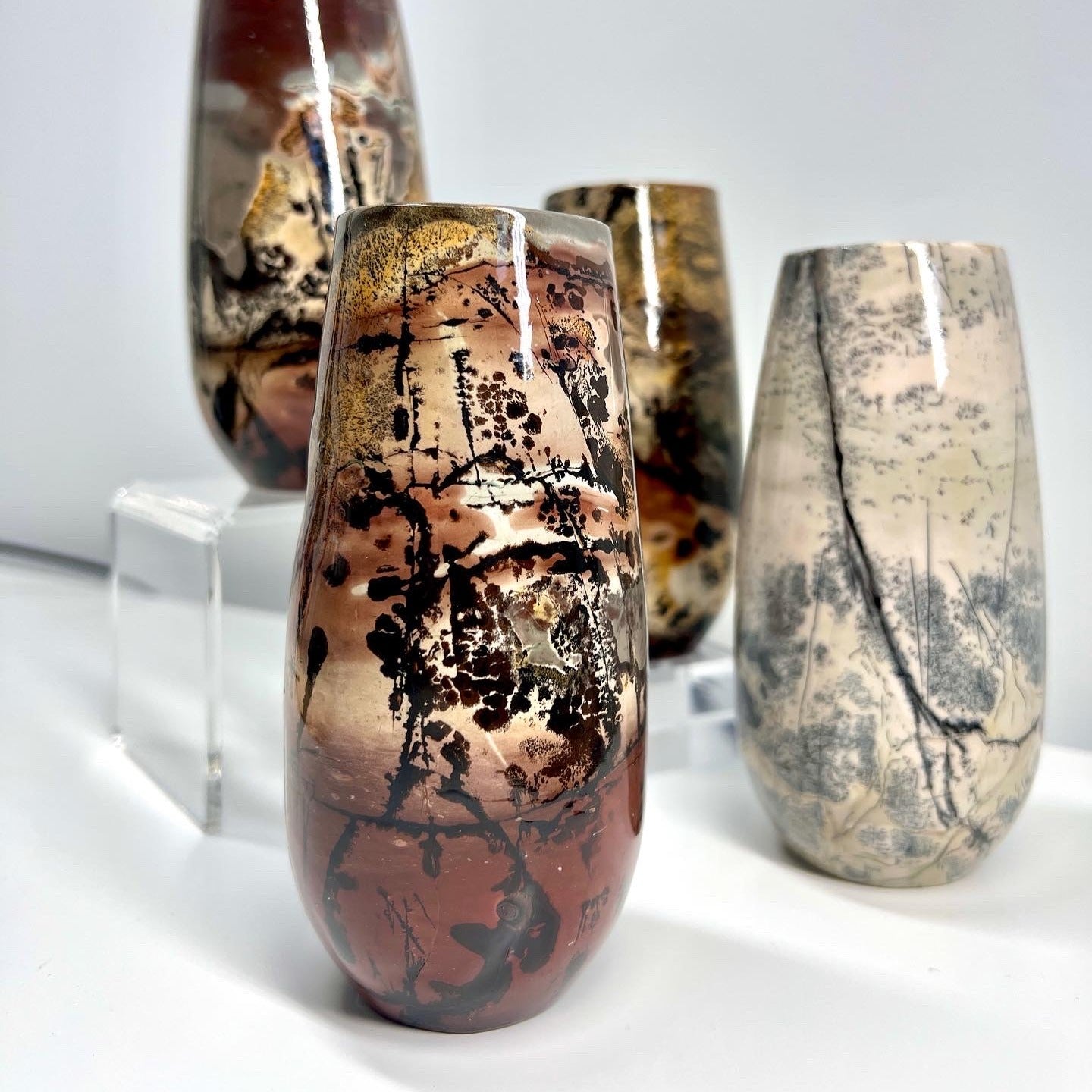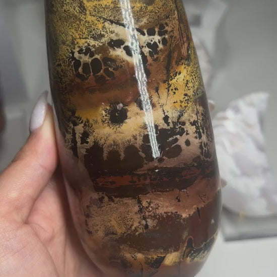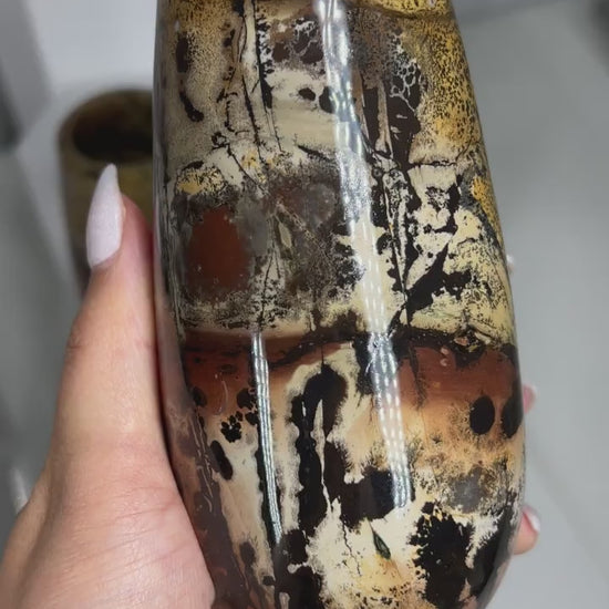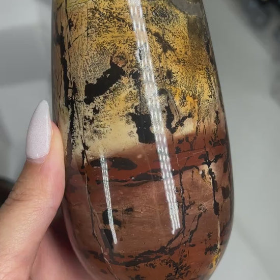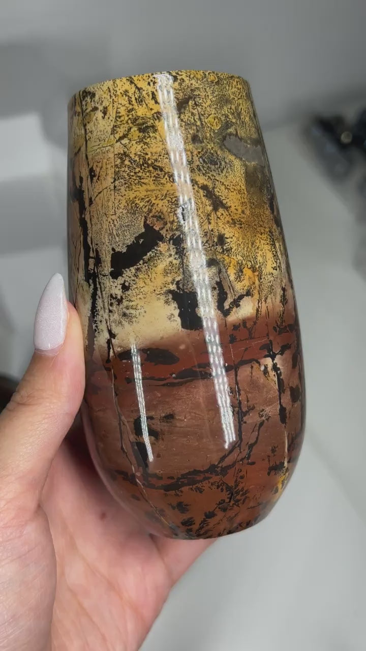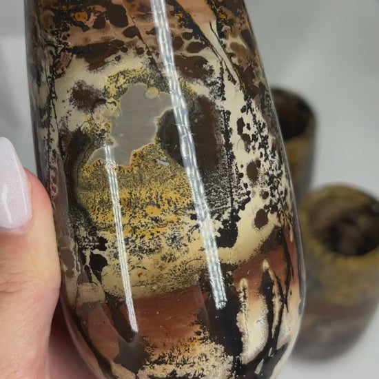 These are gorgeous polished picture jasper vases. They are hand carved from a single large piece of picture jasper and all have glossy finishes. Each piece is a masterpiece hand painted by nature.