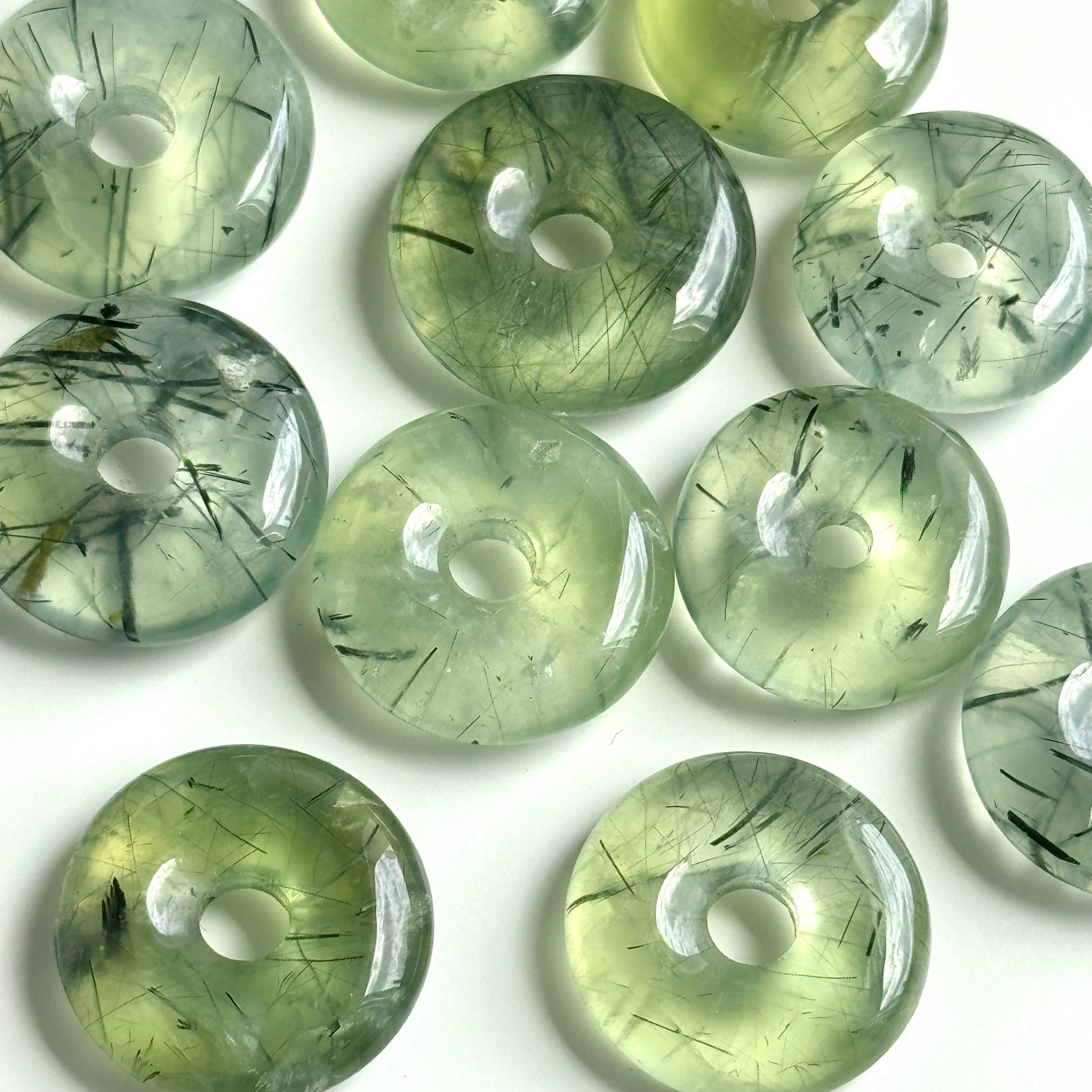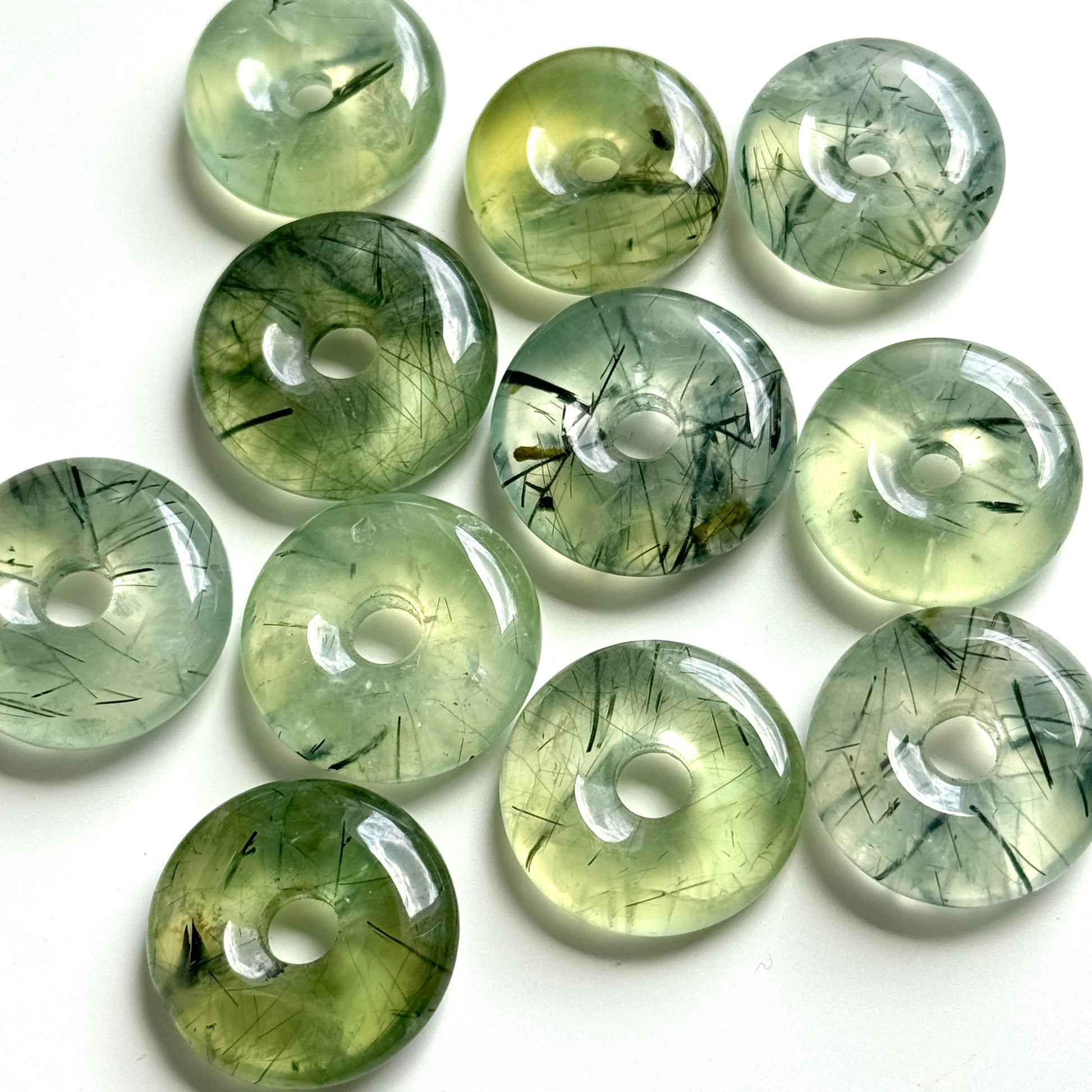 These prehnite donuts are meticulously polished to a smooth, glassy finish.