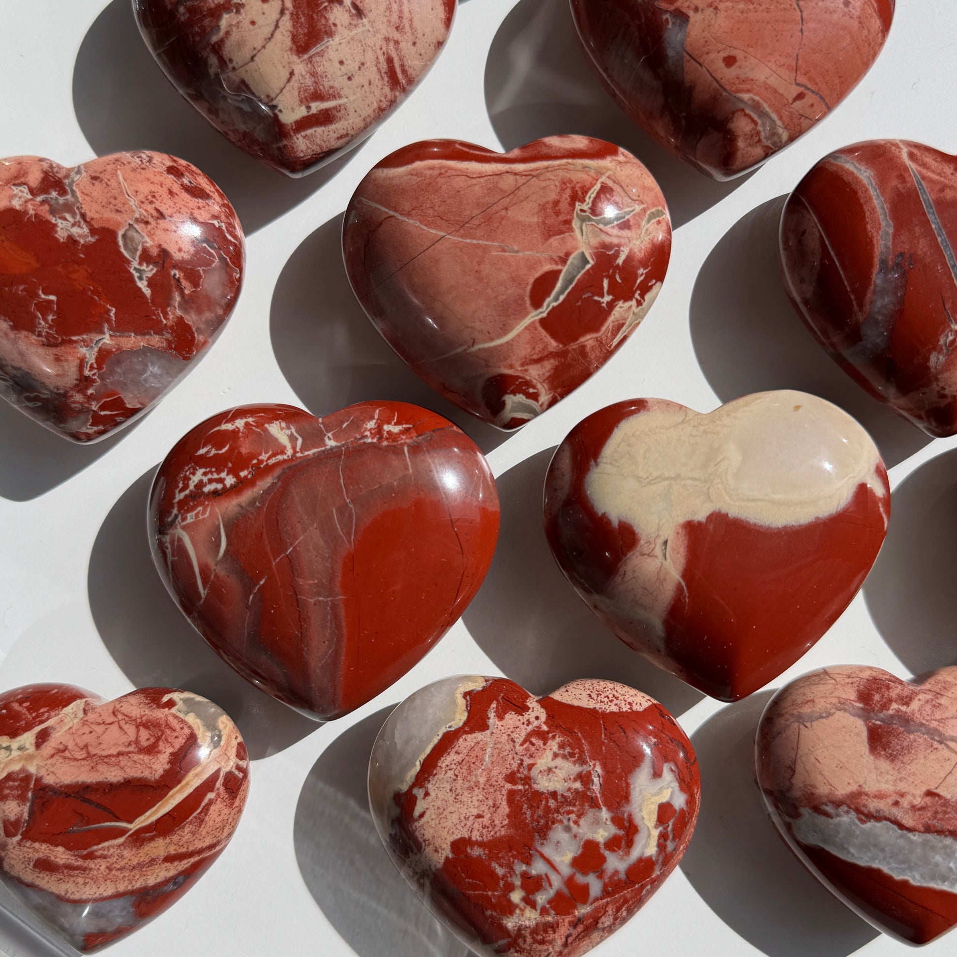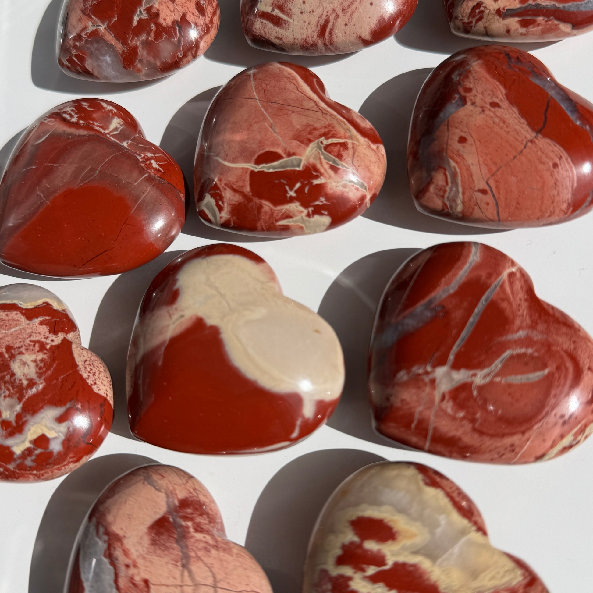 Our red jasper hearts are bursting with beautiful patterns, swirls and white quartz inclusions.