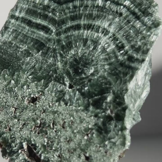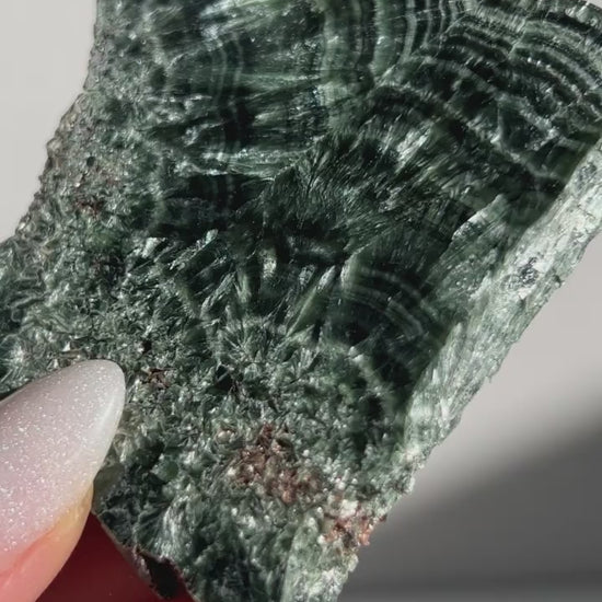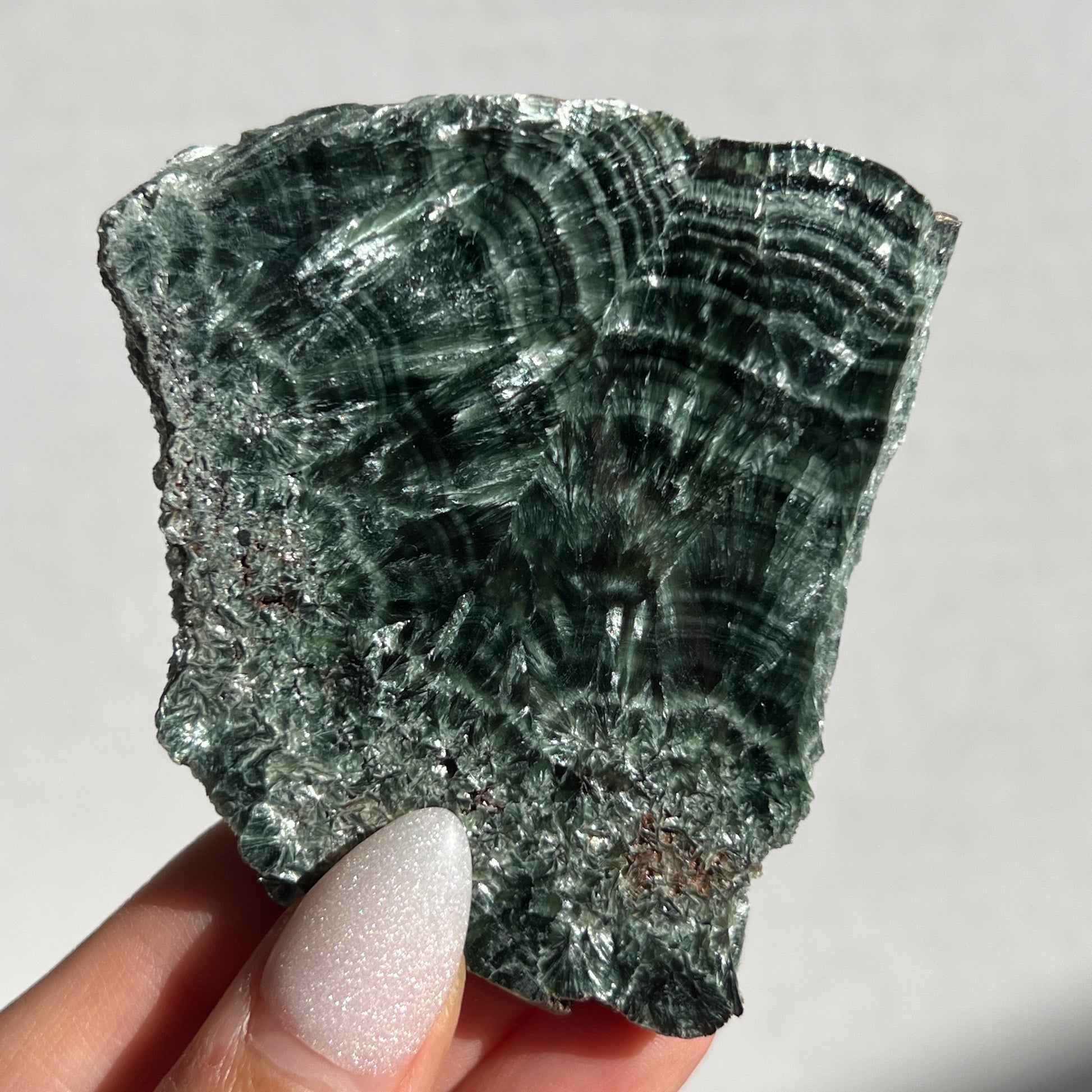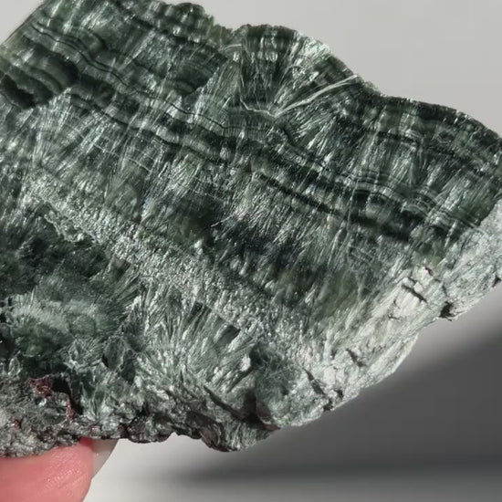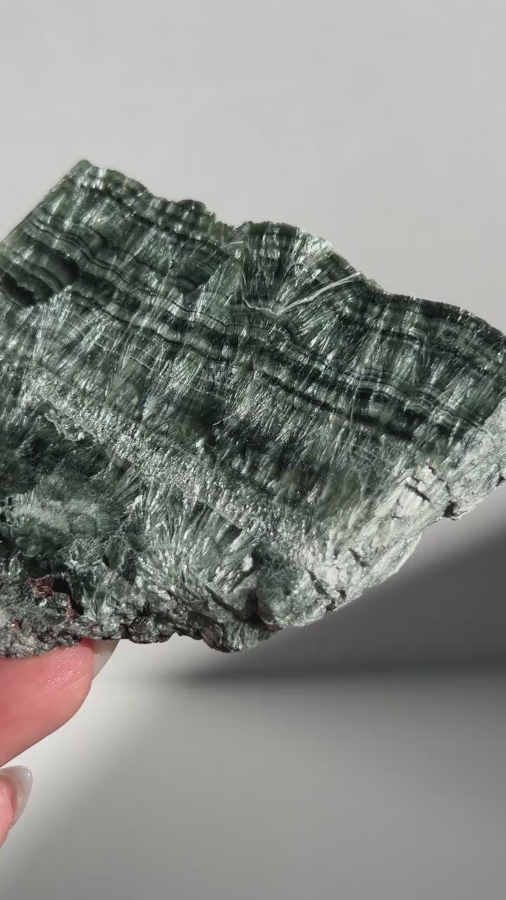 Seraphinite is a beautiful mineral that comes ONLY from Siberia, Russia. It’s sometimes called Clinochlore and is related to Chlorite. This material is known for its angel wing patterns that give it its distinctive appearance. The patterns are silvery and chatoyant with sparkly mica-like inclusions.