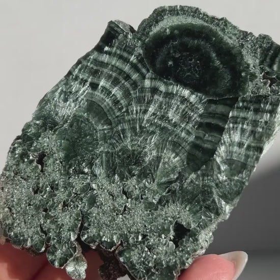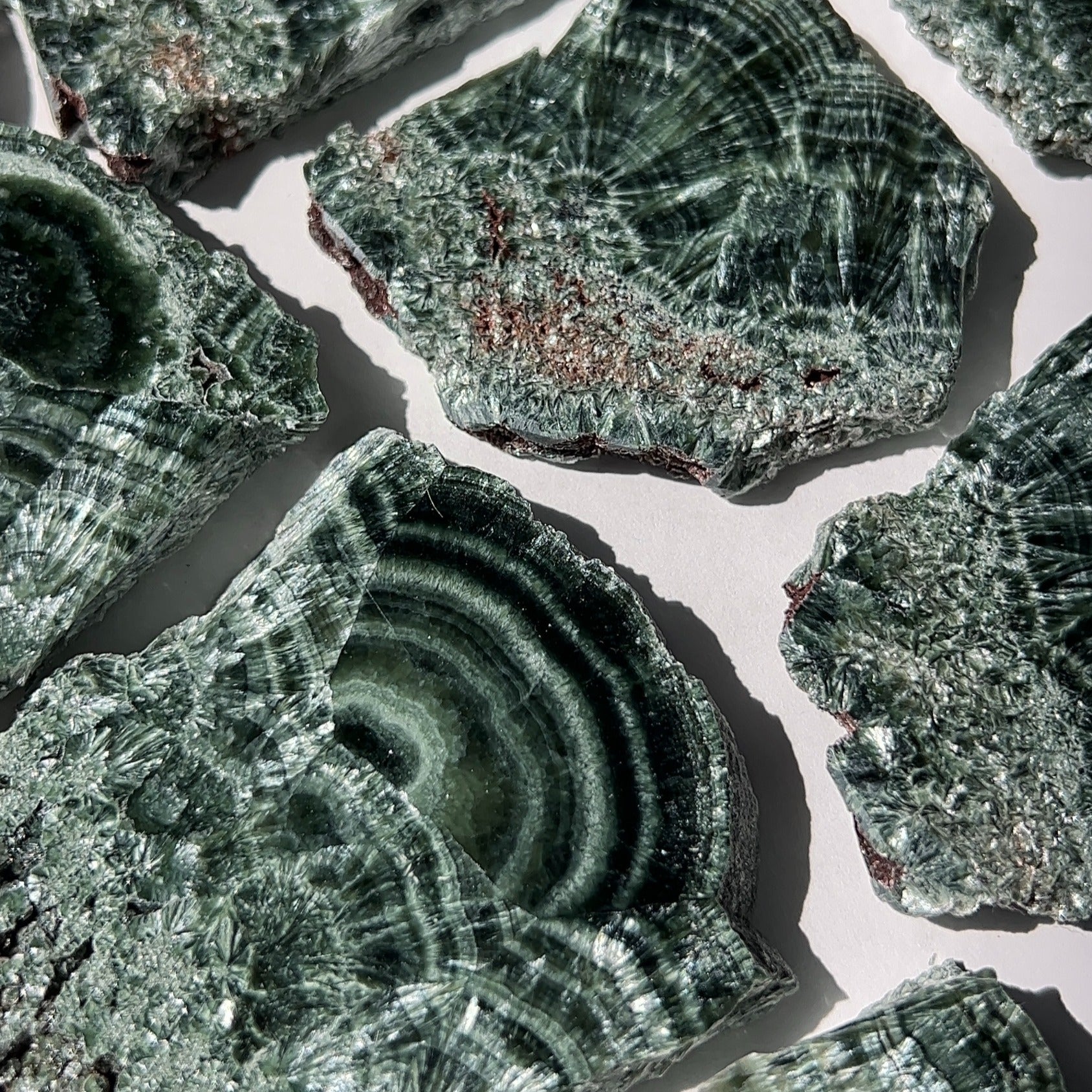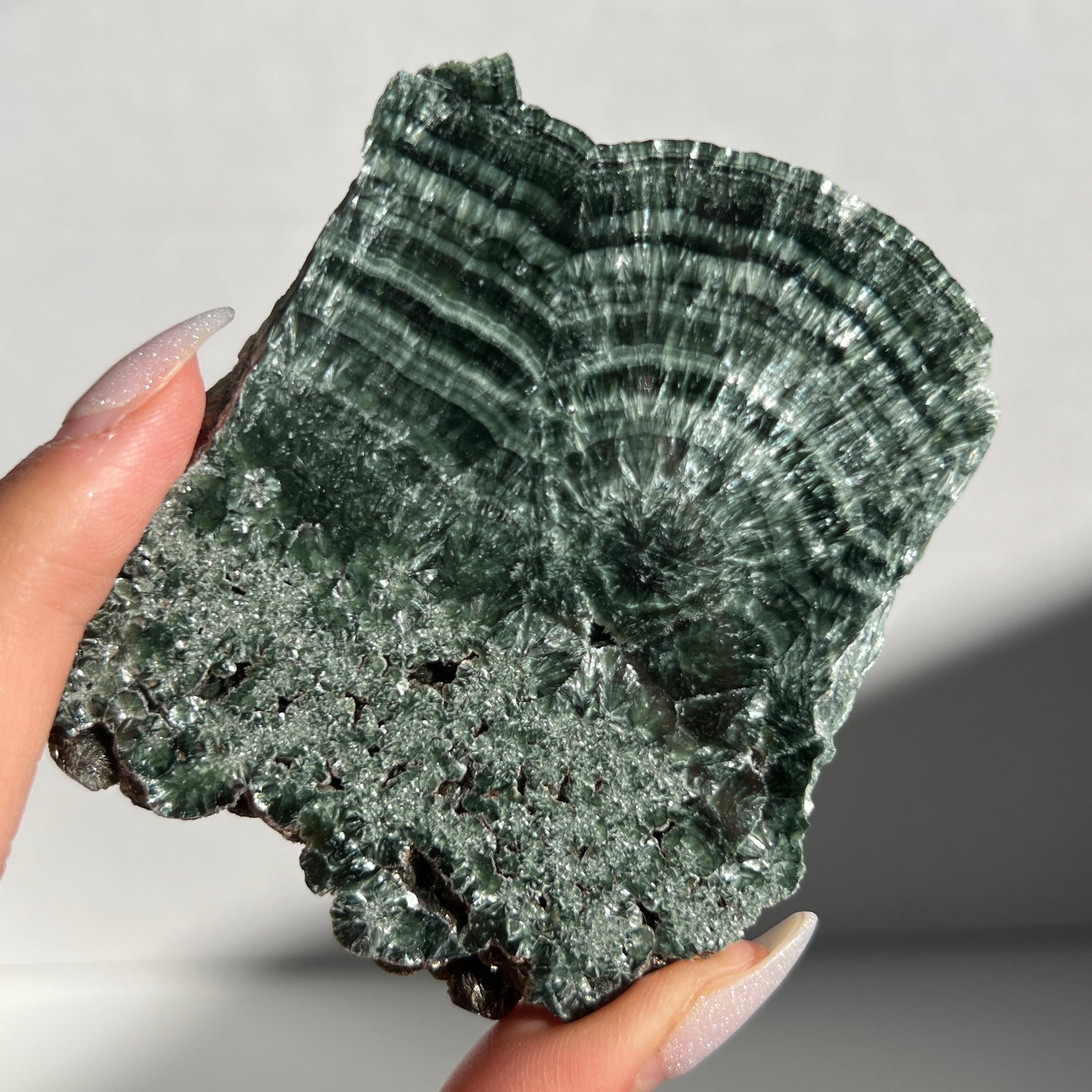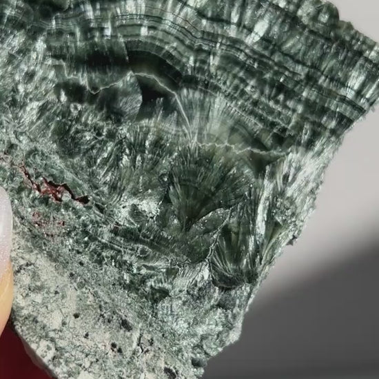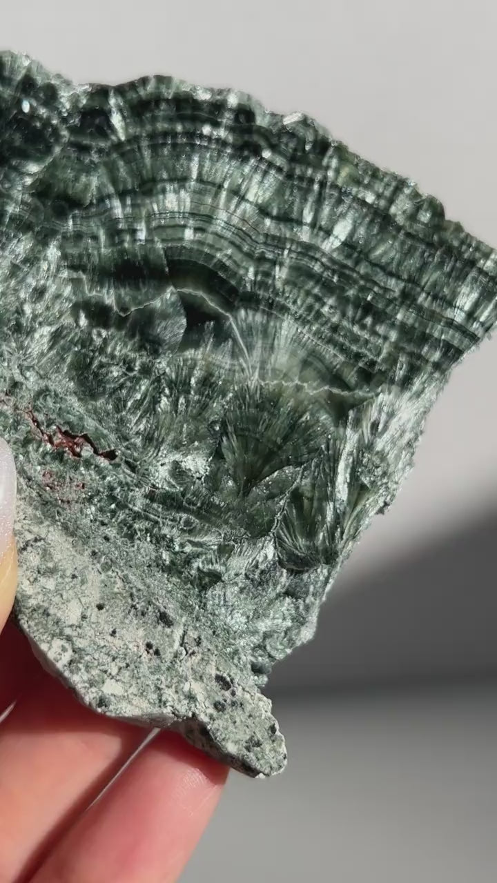 Seraphinite is a beautiful mineral that comes ONLY from Siberia, Russia. It’s sometimes called Clinochlore and is related to Chlorite. This material is known for its angel wing patterns that give it its distinctive appearance. The patterns are silvery and chatoyant with sparkly mica-like inclusions.