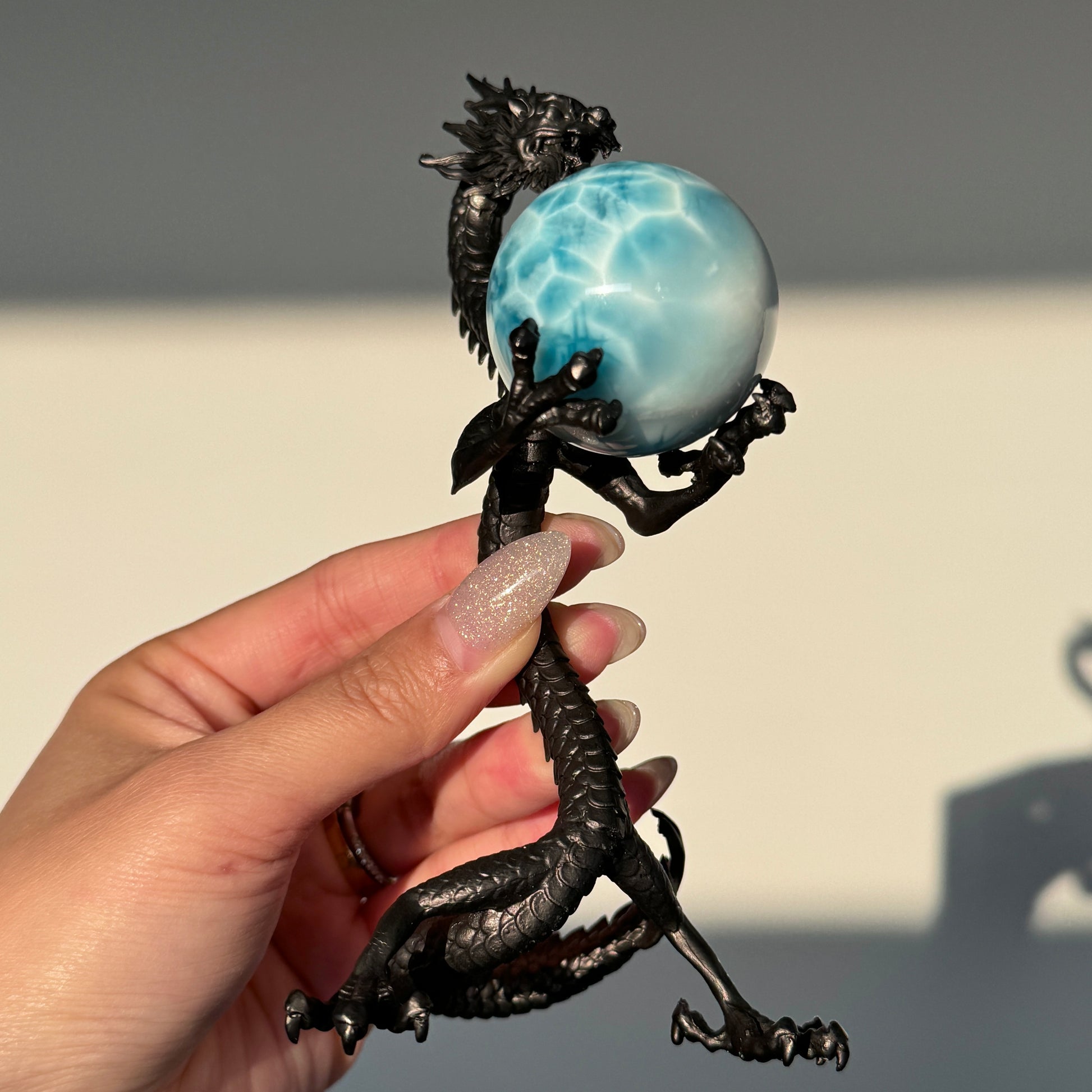 These intricate standing dragon sphere stands can hold two spheres each. One sphere can be placed within the hands of the dragon design and a second sphere can be placed in the tail of the design.